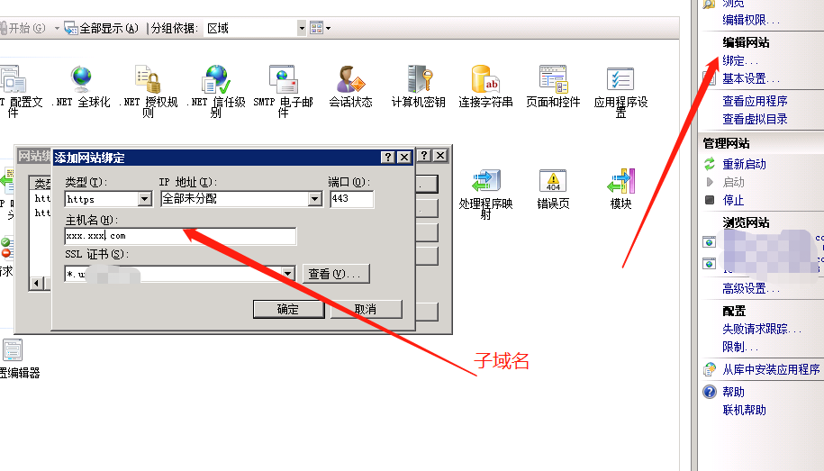 6、直接选择对应的iis网站,点击绑定 填写对应的二级主机名,这样可以实现一个iis上绑定多个子域名