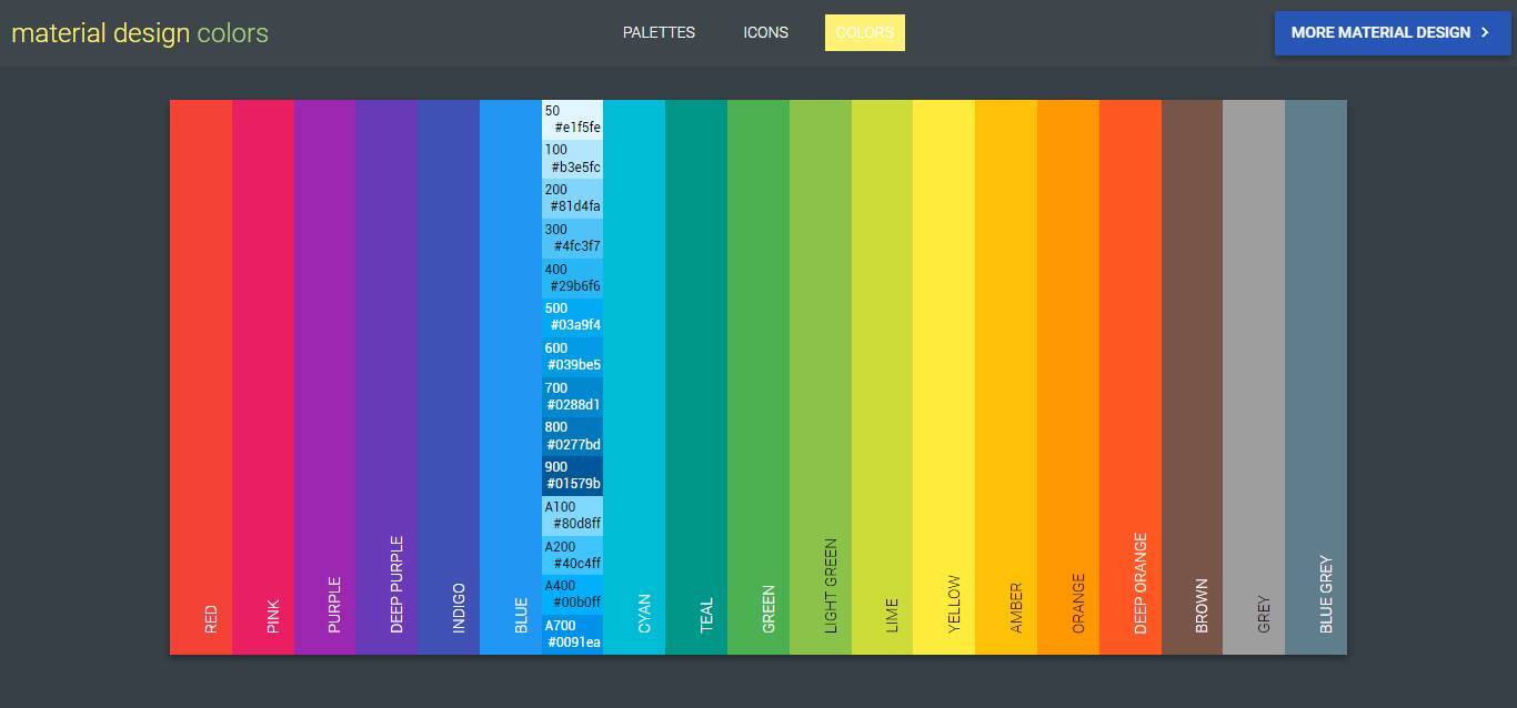 Material Palette是一款提供Material Design配色的线上工具,它的用法很简单,你只要找出想要搭配的两种颜色,它就会显示出两种颜色搭配在一起的效果预览,并提供你较深或较浅的颜色选项,以及其他你可能会用到的颜色代码。