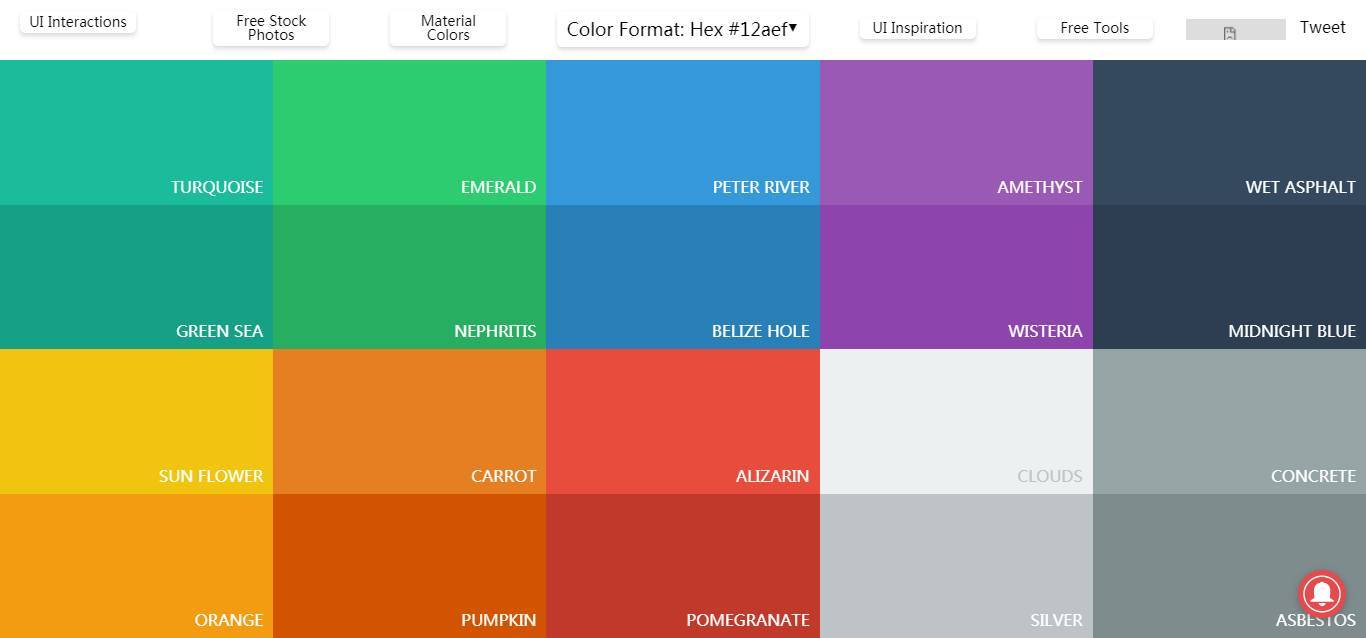 Flat UI Colors采集了扁平化设计中最受欢迎的色彩,可以吸取复制任何你看中的色彩。可以通过选择相似的色调和饱和度,来达到快速配色。还可以免费选择和下载色值到本地。