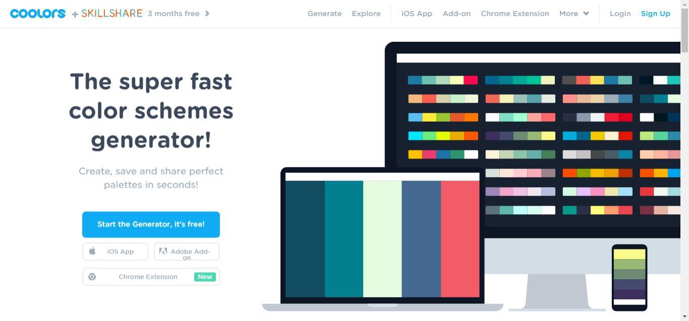 Coolors是一个可以让你简单快速地选色生成工具,为你找出配色的灵感,该网站每次会为你挑选由五种颜色组合而成的调色盘,并显示颜色的代码,你可以快速选取使用,或是锁定其中的几种颜色。