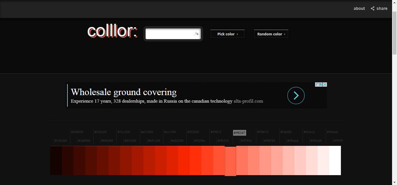首先你可以通过0To255网站选择一个作为出发点的颜色(起始颜色),然后你会看到一个基于起始颜色、有序呈现色彩变化的颜色列表,这些颜色从上至下体现黑白(或者浓淡)的变化,你可以选择自己最满意的颜色,并且可以直接复制代码到自己的网页设计页面,或者直接查看其颜色符号再使用。