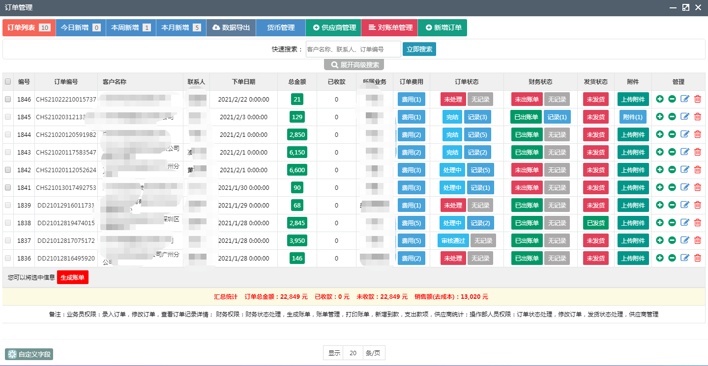 主要板块: 客户管理,跟单管理,订单管理,财务管理,员工管理,权限管理