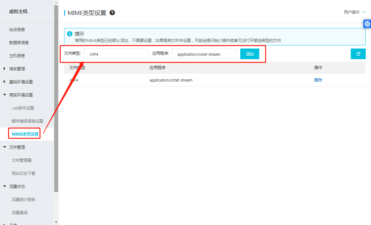 2、如果是云虚拟主机,一般主机的控制面板都会有一个地方可以直接添加MIME类型,比如阿里云的云主机: