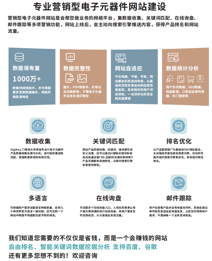 营销型电子元器件网站是会帮您做业务的网络平台,集数据收集、关键词匹配、在线询盘、邮件跟踪等多项营销功能,网站上线后,会主动向搜索引擎推送内容,获得产品排名和网站流量。